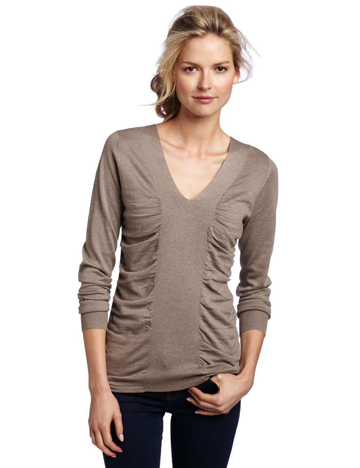 Cotton Modal Cashmere Long Sleeve Ruched Center V-Neck Sweater